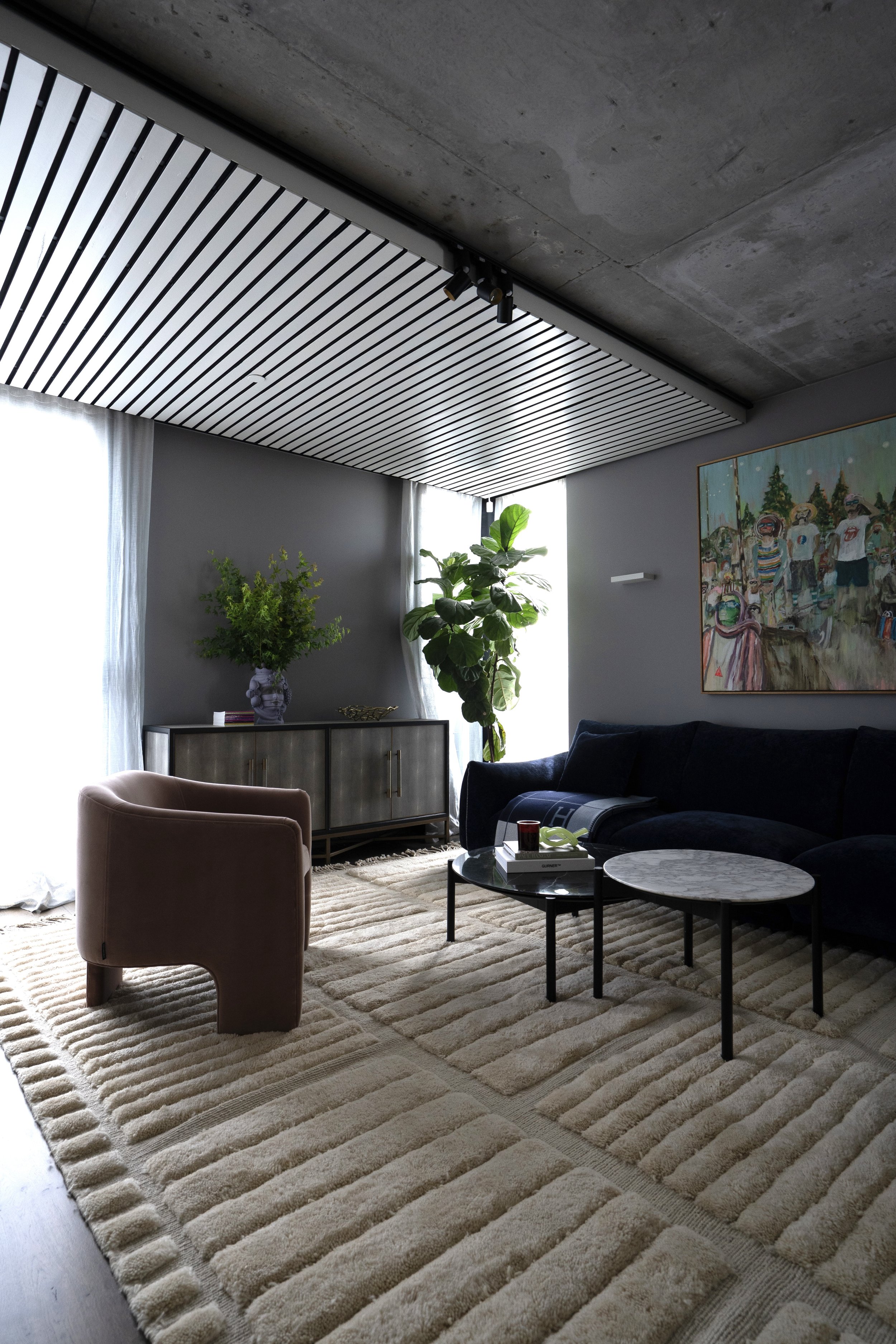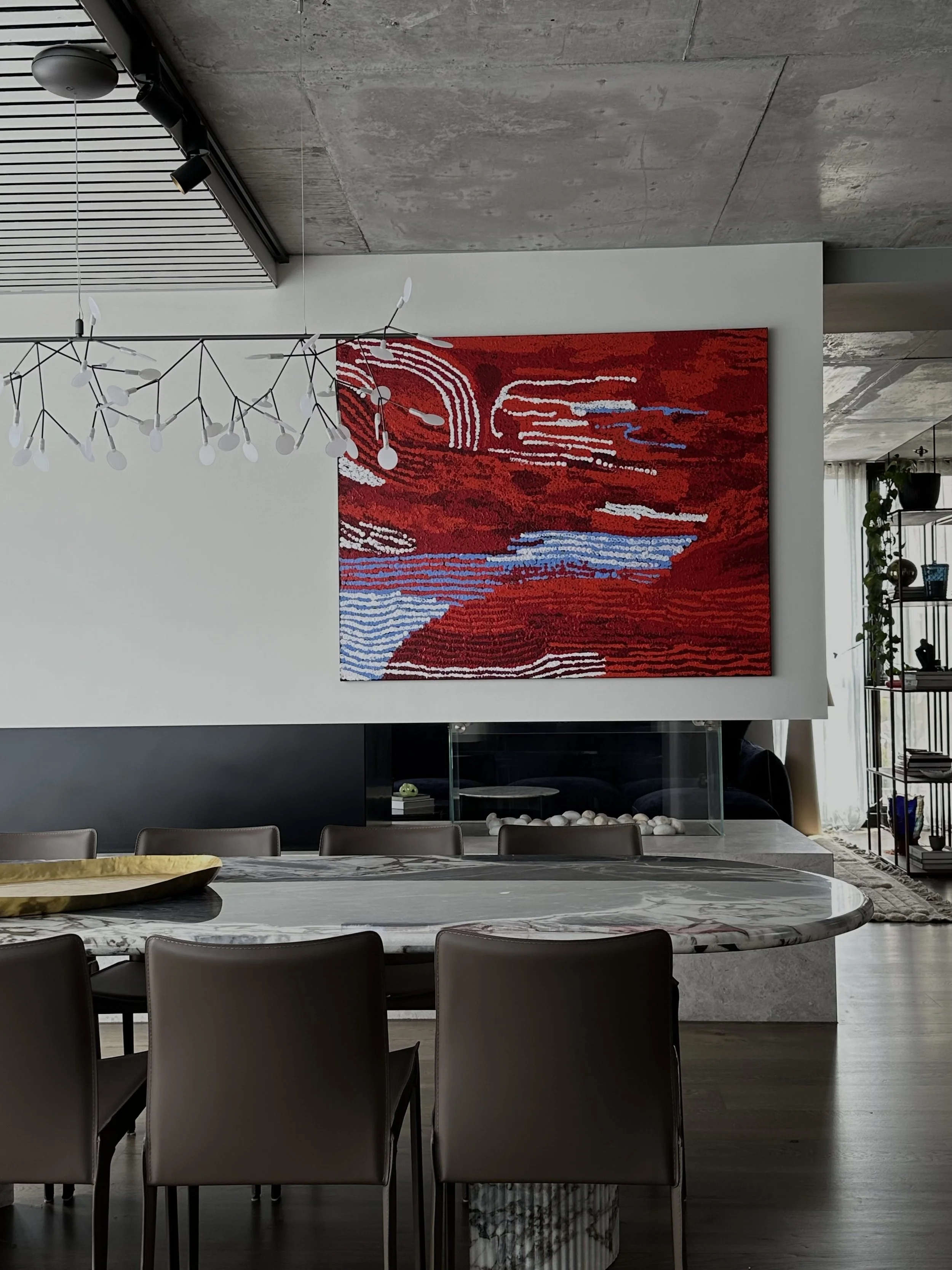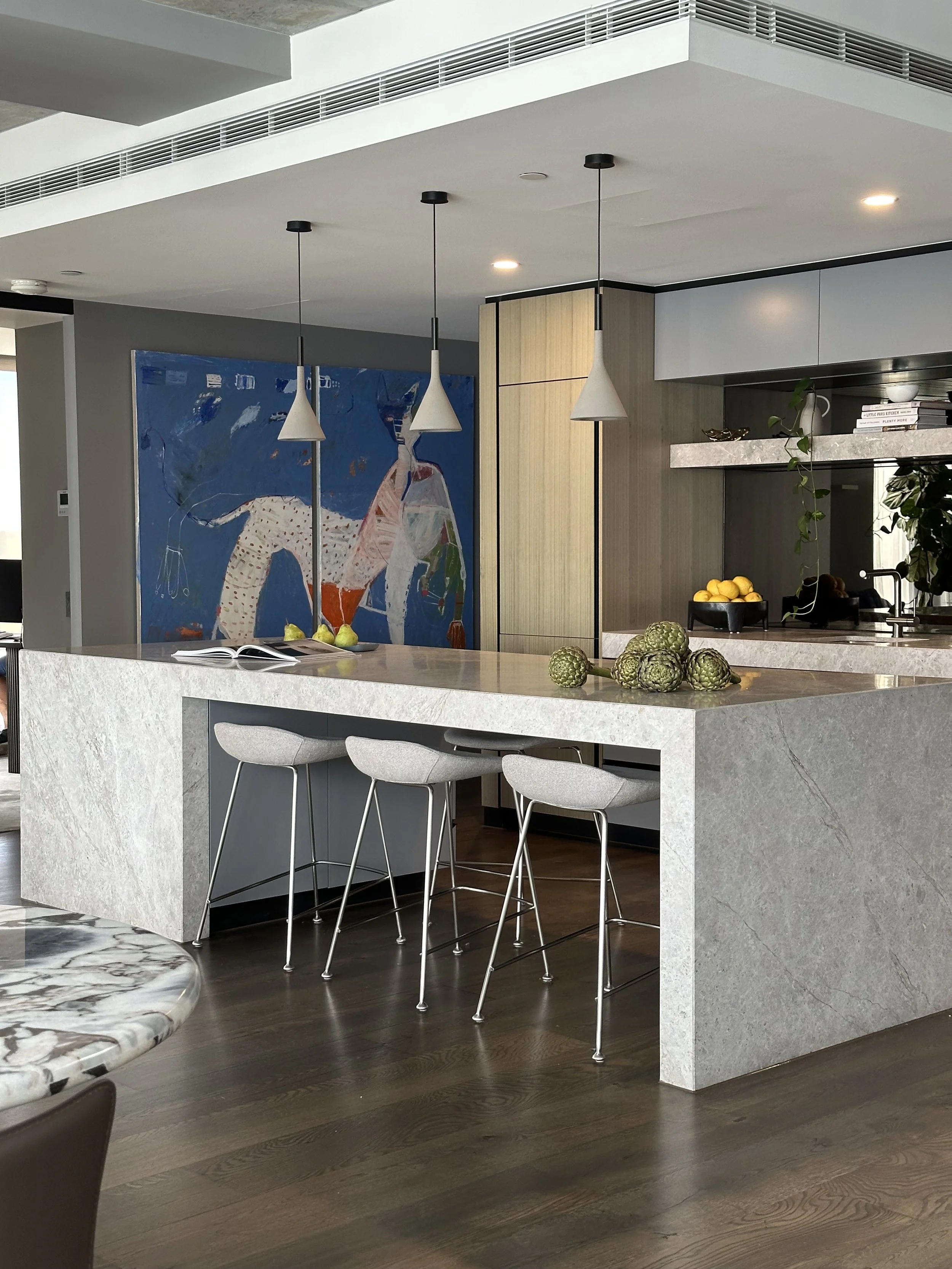 A stunning, contemporary, brutalist penthouse with a curated living environment that is comfortable and stylish but with an edge. It incorporates luxurious finishes, contemporary furniture and exceptional artworks which are punctuated with injections of colour. The plan maximizes the available space and provides a warm and inviting ambiance to relax and entertain whilst still being mindful of cost.